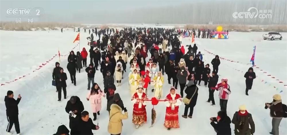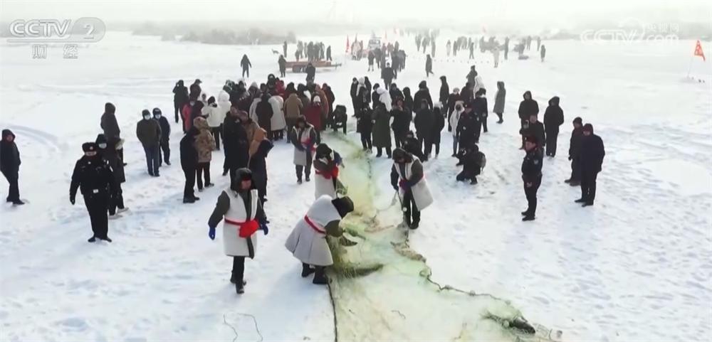 近日,新疆玛纳斯冬捕节起网打渔,游客在冰天雪地中体验“鱼儿满仓迎丰年”的景象。